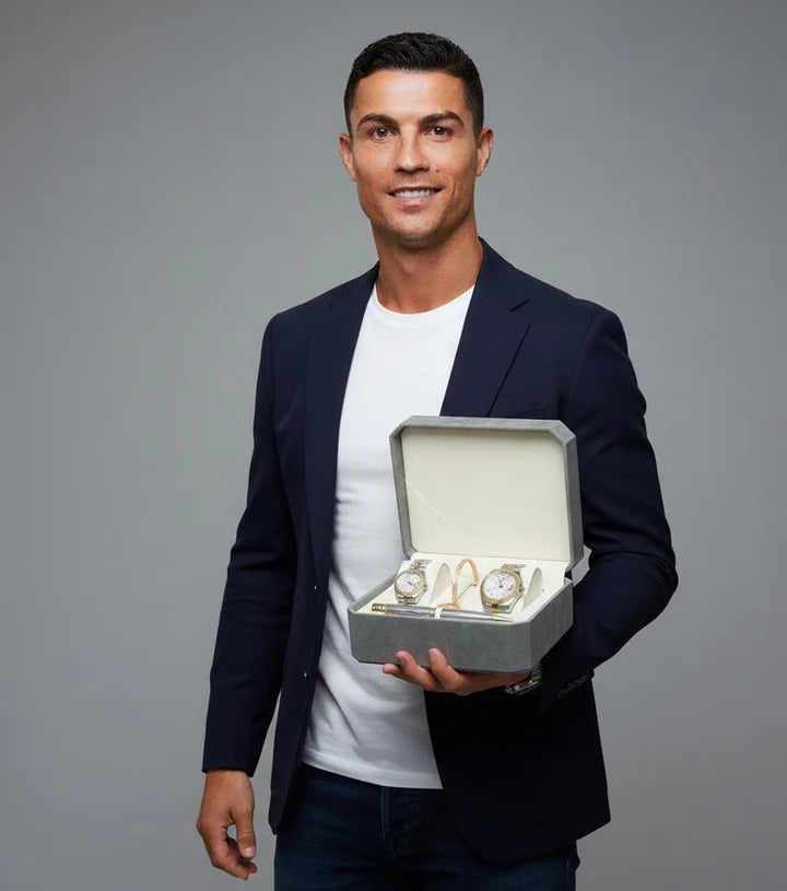 تشمل هذه المجموعة ساعتان متطابقة لها وله باللون الفضي والذهبي وسوار أنيق وخاتم يكملان الساعات مضيفين لمسة أنيقة ورومانسية. وقلم فاخر